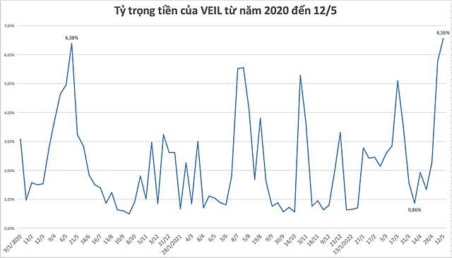 Theo báo cáo tuần của quỹ Vietnam Enterprise Investment Limited (VEIL) thuộc Dragon Capital, tỷ trọng tiền mặt tại quỹ ở mức 6,56% ngày 12/5. Với quy mô hơn 2,1 tỷ USD, giá trị tiền mặt tương ứng đạt 140,9 triệu USD (khoảng 3.241,5 tỷ đồng). Đây là tỷ trọng tiền mặt cao nhất mà VEIL nắm giữ từ 2020 đến nay, cao hơn mức 6,38% tại tháng 5/2020 khi dịch Covid-19 bắt đầu bùng phát.