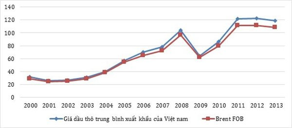 Giá dầu thô trung bình xuất khẩu của Việt Nam và Brent FOB, 2000-2013 (USD/thùng)