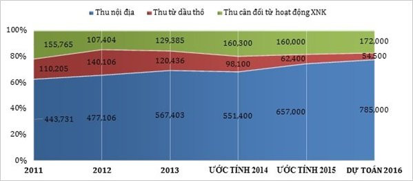 Cơ cấu ba nguồn thu chính trong ngân sách, 2011-2015 (tỉ đồng)