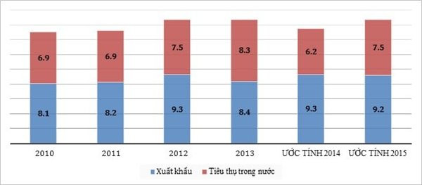 Phân phối sản lượng sản xuất dầu thô Việt Nam theo thị trường tiêu thụ, 2010-2015 (triệu tấn)