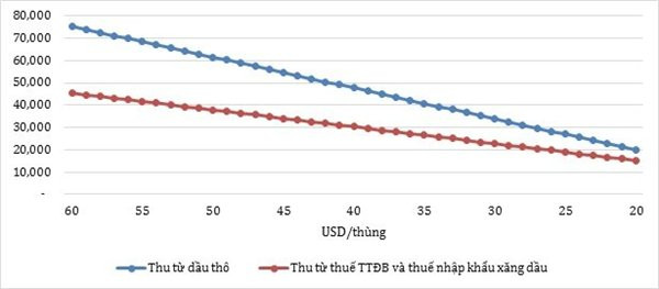 Nghiên cứu khảo sát phạm vi biến động từ 20-60 USD/thùng của giá dầu thô trung bình trong năm 2016. Kết quả tính toán cho thấy nguồn thu ngân sách từ dầu thô (bao gồm thuế xuất khẩu, phí môi trường, thuế thu nhập doanh nghiệp, phí khai thác). Trung bình nếu giá dầu thô giảm xuống 1 USD, thu ngân sách từ dầu sẽ giảm tương ứng gần 1.400 tỉ đồng. Tương tự, ngân sách cũng bị ảnh hưởng từ giá xăng nhập khẩu đi xuống. Ước lượng cho thấy ngân sách sẽ giảm xấp xỉ 760 tỉ đồng tương ứng với mỗi USD giảm xuống của giá dầu thô.