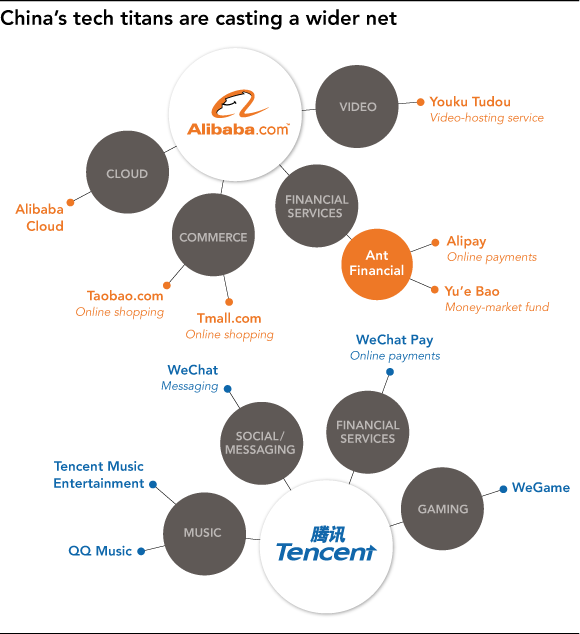 Dù hai công ty từng hoạt động ở những lĩnh vực khác nhau – Tencent thống trị truyền thông xã hội và game, Alibaba trên mảng thương mại điện tử - nhưng họ đều đang cạnh tranh lẫn nhau ở các cơ hội đầu tư. Kết quả là cuộc cạnh tranh khắc nghiệt giữa hai trong số những công ty phát triển nhanh nhất và giàu nhất thế giới, để thống trị các doanh nghiệp từ trí thông minh nhân tạo đến nội dung Hollywood, phân phối thực phẩm đến fintech, và nghiên cứu gen đến nhận diện giọng nói. Thực tế, họ đang chuyển đổi từ doanh nghiệp công nghệ sang các công ty đầu tư ồ ạt.