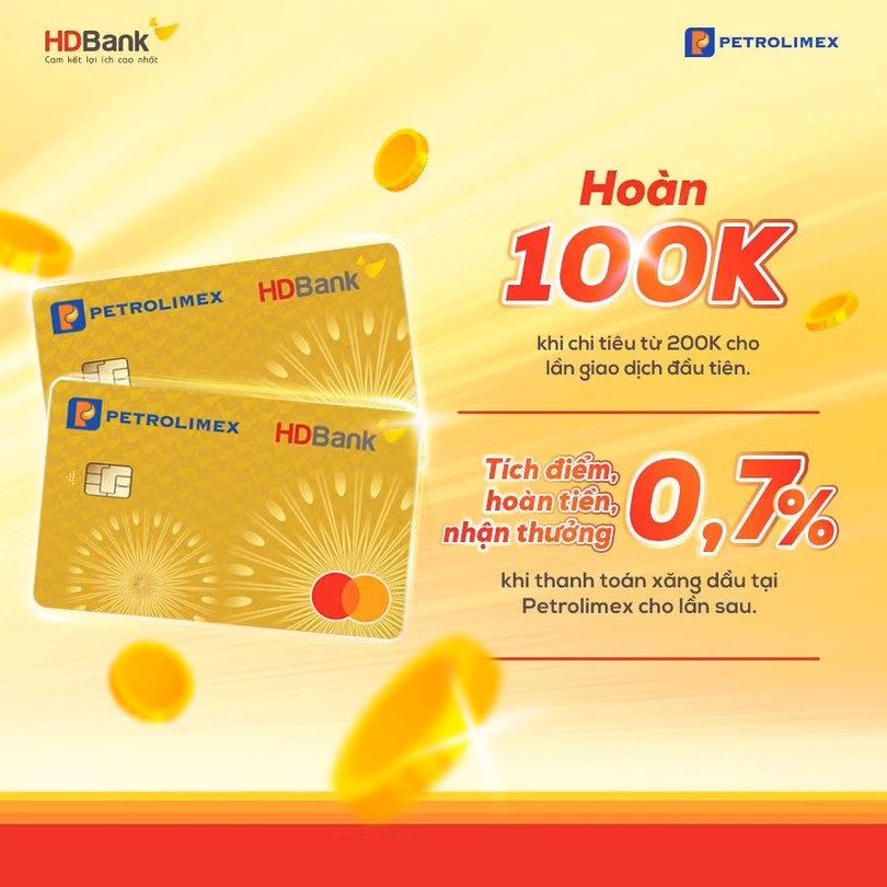 Được biết, khi thanh toán đổ xăng hoặc thực hiện bất kỳ giao dịch đầu tiên nào từ 200 nghìn đồng từ nguồn tiền thẻ tín dụng, khách hàng sẽ được hoàn lại 100 nghìn đồng từ HDBank. Trong những lần thanh toán đổ xăng sau tại Petrolimex từ nguồn tiền thẻ tín dụng, khách hàng sẽ được tích điểm, hoàn tiền, nhận thưởng 0,7%. Trong đó 0,2% sẽ được HDBank hoàn tiền vào tài khoản thẻ tín dụng, 0,5% sẽ được quy đổi thông qua chương trình Petrolimex ID do Petrolimex quản lý.