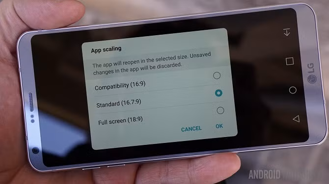 Hầu hết ứng dụng đều không gặp vấn đề gì với màn hình 18:9 trên G6 vì nó có thể tự kéo dài ra cho đầy màn hình. Đối với các ứng dụng chạy toàn màn hình, LG hỗ trợ tính năng App scaling cho phép lựa chọn tỉ lệ phù hợp để chạy ứng dụng đó (16:9, 16.7:9 hoặc 18:9) bằng cách vuốt từ trên xuống.