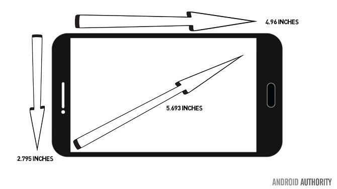 Với Galaxy Note 5, màn hình trên máy có chiều rộng 2,795 inch (7,0993cm) và chiều cao 4,96 inch (12,5984cm). Nếu áp dụng định lý Pythagoras thì ta sẽ có phép tính 2,795^2 + 4,96^2 = 31,413625. Lấy căn bậc hai của kết quả trên thì đáp số sẽ là 5,693297, làm tròn lên là 5,7.