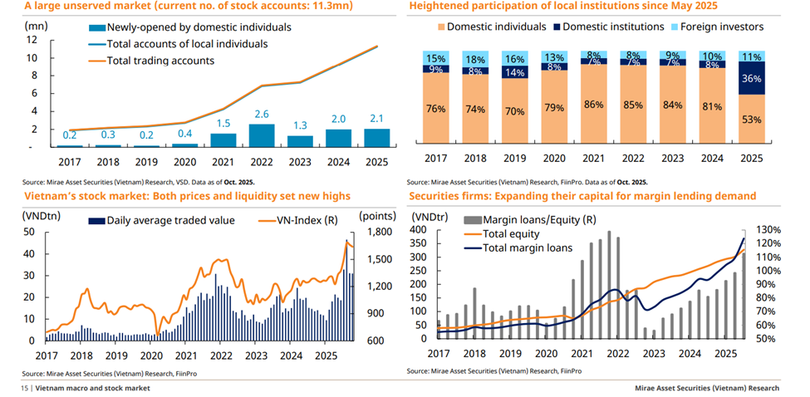 Trong khi đó, Mirae Asset đánh giá nhà đầu tư nội sẽ tiếp tục đóng vai trò chủ đạo trong bối cảnh dòng vốn ngoại biến động khó lường. Công ty phân tích cho rằng các yếu tố cần theo dõi gồm chính sách lãi suất quốc tế, rủi ro địa chính trị và biến động giá hàng hóa.