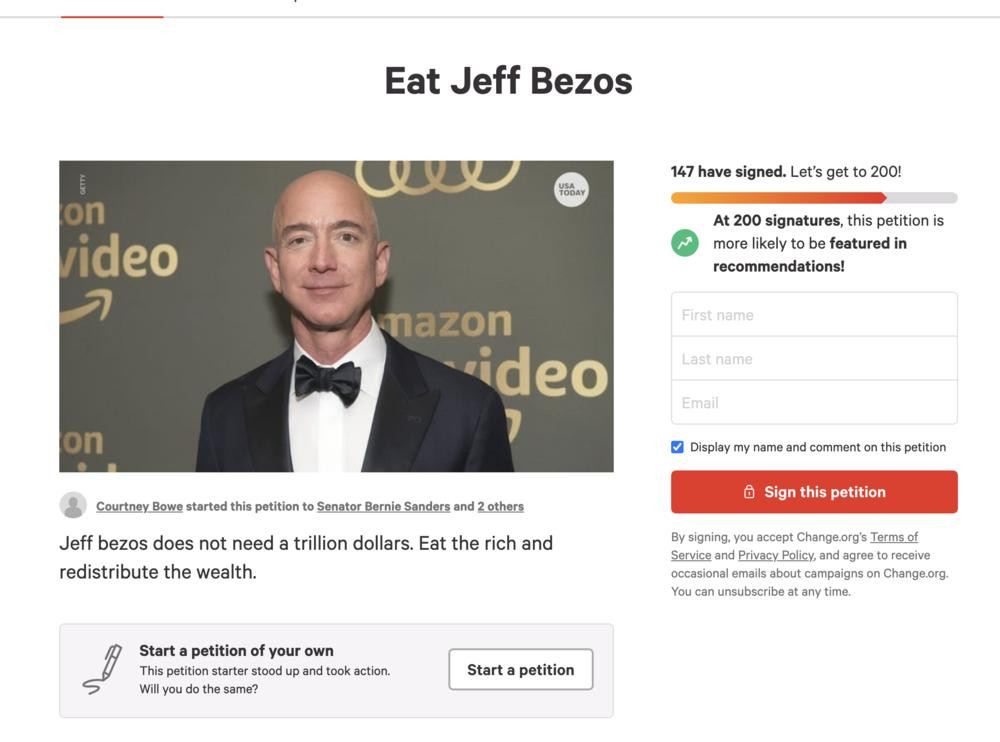 Nhập từ khóa "Bezos" trên trang web change.org, có hàng nghìn kết quả tìm kiếm hiển thị, đều là các loại kiến nghị kỳ lạ. Một số người đề nghị Bezos bỏ ra một phần tài sản khổng lồ để giải quyết nạn đói toàn cầu; một số người cho rằng ông nên giúp đám cháy Amazon ở Brazil, "Vì bạn sử dụng tên Amazon, bạn nên bảo vệ rừng Amazon"! Một kiến nghị khác là "Ăn Bezos" và phân phối lại tài sản của ông ta cho người Mỹ!