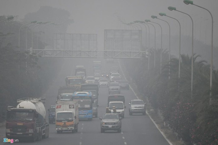 Chất lượng không khí ở Hà Nội xuống mức thấp ngày 14/12, khiến tầm nhìn tại đại lộ Thăng Long giảm xuống.