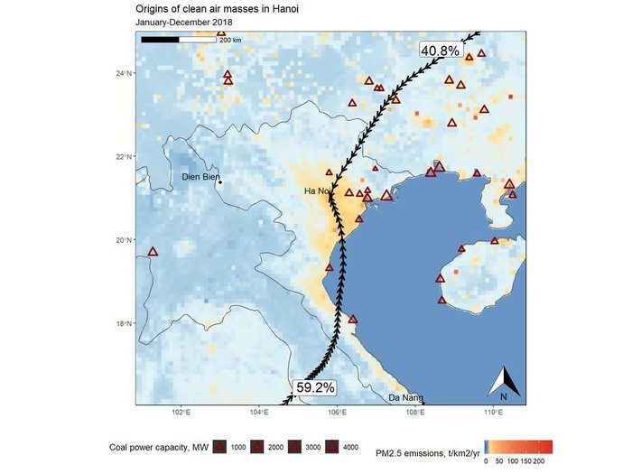 Còn trong 169 lần mà không khí Hà Nội ít ô nhiễm nhất (dưới 10 microgram/m3, kéo dài ít nhất 3 giờ), 41% số lần có khối khí thổi từ hướng bắc, và 59% số lần có khối khí thổi từ hướng nam, thay vì đi qua cụm công nghiệp phía đông Hà Nội (như trên bản đồ dưới đây).
