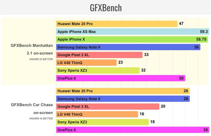 Báo cáo của Hristov cũng sử dụng chuẩn GFXBench dựa trên GPU để xem sự khác biệt về sức mạnh đồ họa, nhưng chipset của Huawei vẫn bị bỏ lại phía sau so với chipset A11 Bionic và A12 Bionic, cũng như Qualcomm Snapdragon 845 SoC của Samsung Galaxy Note 9.