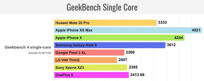Theo báo cáo của Victor Hristov trên trang phoneArena, kết quả benchmark đơn lõi của Geekbench cho thấy Huawei Mate 20 Pro được hỗ trợ bởi vi xử lý HiSilicon Kirin 980 có số điểm là 3.333, trong khi iPhone XS Max được trang bị chip A12 Bionic của Apple đạt mức điểm 4.821.