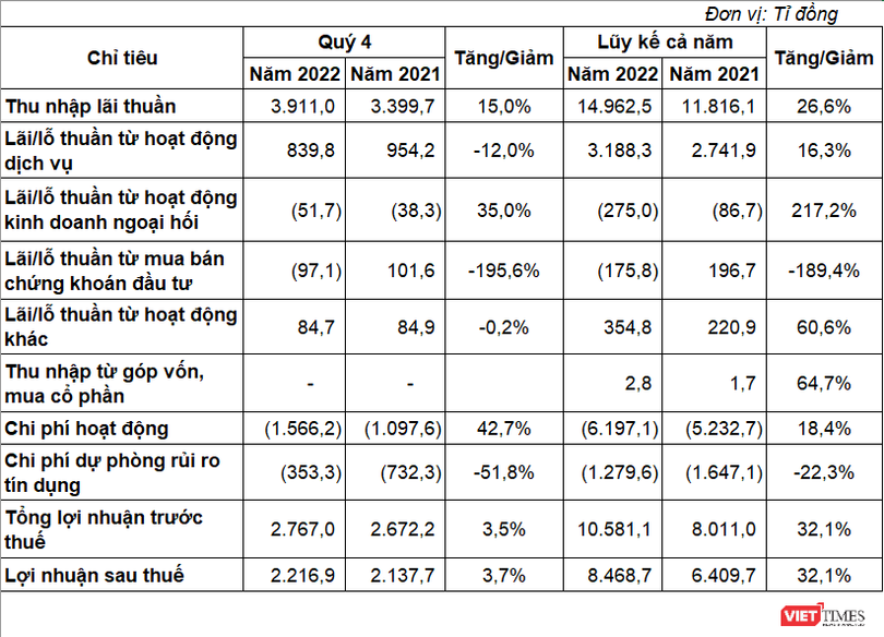 Lũy kế cả năm 2022, lợi nhuận trước thuế của VIB đạt 10.581,1 tỉ đồng, tăng 32,1% so với năm 2021.