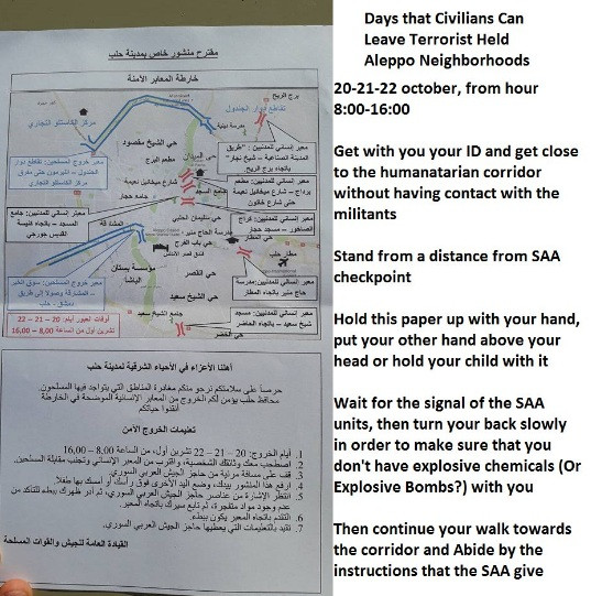 Tình hình chiến sự Syria ngày 20.10.2016, quân đội Syria ngừng bắn và chuẩn bị tất cả cho cuộc di tản nhân đạo lớn nhất từ trước tới nay, nhưng chưa có thông tin đáng mừng nào từ phía lực lượng Hồi giáo cực đoan và người dân khu vực miền Đông thành phố Aleppo. Al Nusra (Al Qaeda Syria tiếp tục pháo kích khủng bố dân thường