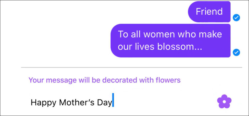 Cụ thể, khi nhắn tin, ngay góc phải dưới màn hình sẽ xuất hiện một biểu tượng bông hoa nhỏ xinh. Khi bấm vào biểu tượng đó trước khi gửi, tin nhắn của bạn sẽ được trang trí những bông hoa vô cùng đáng yêu. Cũng với một tin nhắn đầy yêu thương những bông hoa này sẽ là món quà bất ngờ và vô cùng ý nghĩa dành tặng cho mẹ cũng như những người mà bạn yêu thương.