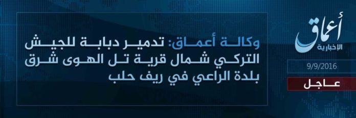 Theo thông tin của cơ quan truyền thông cánh của thế lực tự xưng "Nhà nước Hồi giáo Al-Amaq", lực lượng của chúng đã phá hủy các xe tăng của Thổ Nhĩ Kỳ tại Tal Al-Hawa, nằm gần thị trấn Al-Ra'i.
