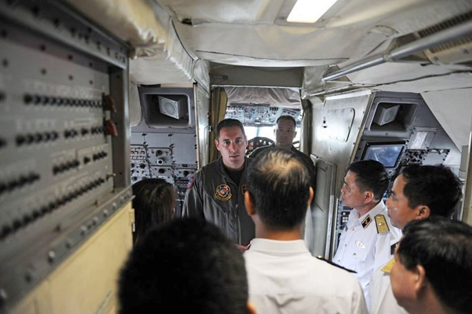 Các sĩ quan Hải quân Việt Nam trên máy bay săn ngầm P-3C Orion của Không đoàn VP-47 Hải quân Mỹ ở Hawaii ngày 13.4.2016 - Ảnh: Không đoàn VP-47