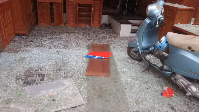 Một ngôi nhà ở dãy nhà đối diện bên kia đường bị sức ép của vụ nổ làm vỡ vụn kính.