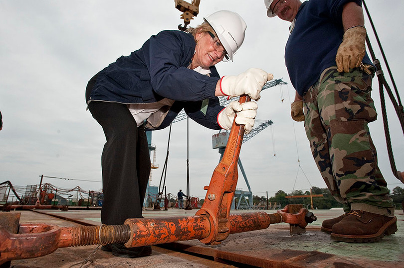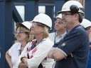 Susan Ford - con gái của Gerald R. Ford kiêm nhà tài trợ danh dự đã dến thăm con tàu mang tên cha vào năm 2011. Bà cũng theo sát nhiều công đoạn chế tạo của USS Gerald R. Ford và trong hình trên, bà đang giúp một kỹ sư siết lại một thành phần trên boong chính của tàu.