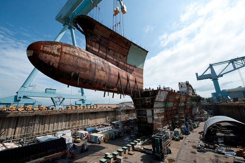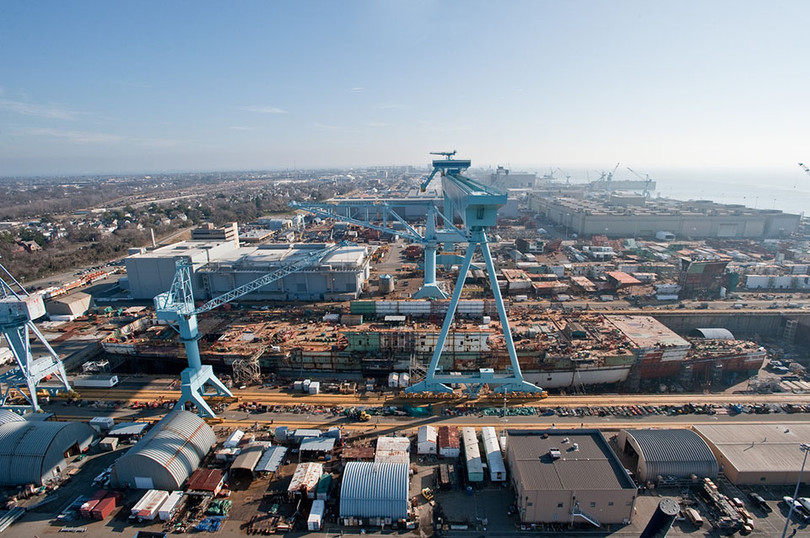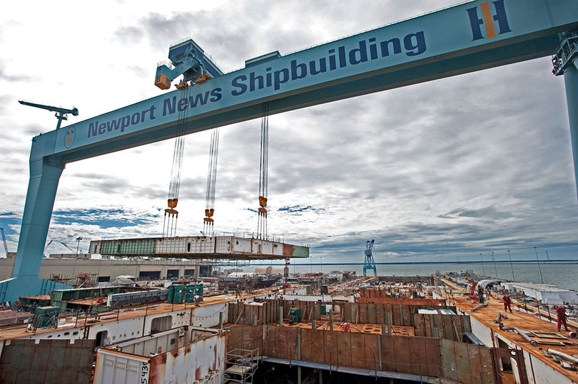 Cần trục tại Newport New Shipbuilding đang tiến hành lắp ghép phần trên mũi tàu nặng 787 tấn. Đây là một công đoạn đòi hỏi sự chính xác rất cao.