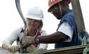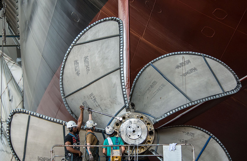 Các công nhân đang siết những con ốc trên một chân vịt của tàu USS Gerald R. Ford bằng một chiếc cần siết lực. Tàu được trang bị 4 chân vịt, dùng 2 lò phản ứng hạt nhân A1B. Các chân vịt sẽ giúp tàu thuộc lớp Gerald R. Ford đạt được tốc độ 35 dặm/giờ (56 km/h), một tốc độ đáng nể đối với một con tàu nặng hơn 100.000 tấn trên biển.