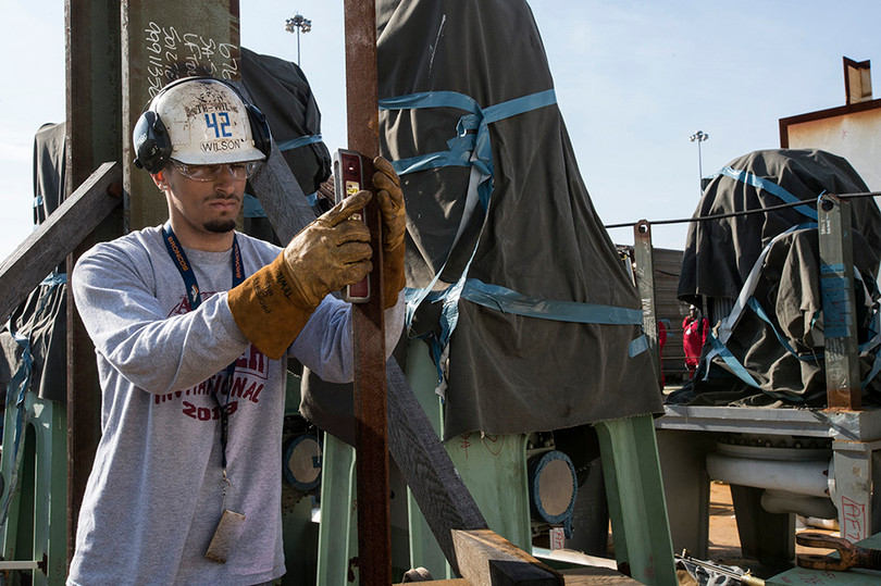 Trong hình là chuyên viên lắp đặt đường ống Trevin Wilson đang làm việc trên tàu USS John F. Kennedy. Các hàng không mẫu hạm thuộc lớp Gerald R. Ford được thiết kế với số lượng đường ống hàn chì giảm thiểu đáng kể. So với các tàu chiến thuộc lớp Nimitz, USS John F. Kennedy có số lượng các van ống dẫn ít hơn 1/3.