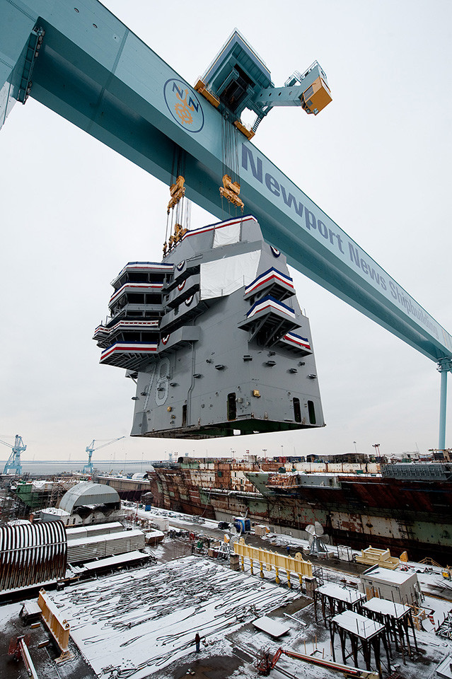 Cần trục cỡ lớn Big Blue tại xưởng đóng tàu Newport News Shipbuilding đang đưa tháp kiểm soát không lưu lên tàu USS Gerald R. Ford hồi tháng 1 năm 2013.
