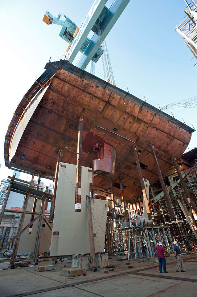 Trong quá khứ, những con tàu chiến thường được chế tạo từ dưới lên trên. Ngày nay, tàu được chế tạo dạng mô-đun lắp ghép. Trong hình, các kỹ sư đang hạ miếng ghép cấu trúc cuối cùng của tàu USS Gerald R. Ford.