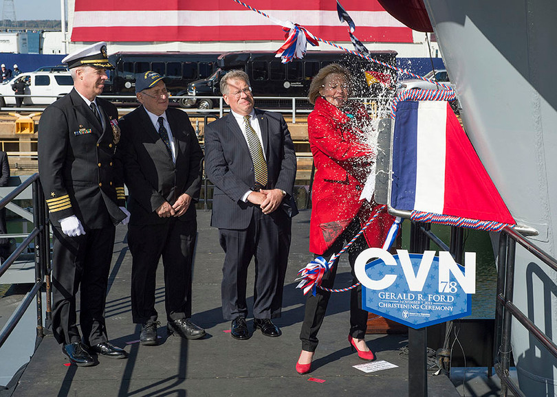 Lễ đặt tên cho tàu CVN-78 Gerald R. Ford diễn ra vào ngày 9 tháng 11 năm 2013. Trong hình, bà Susan Ford đập một chai rượu Bồ Đào Nha thượng hạng vào vỏ mũi tàu.
