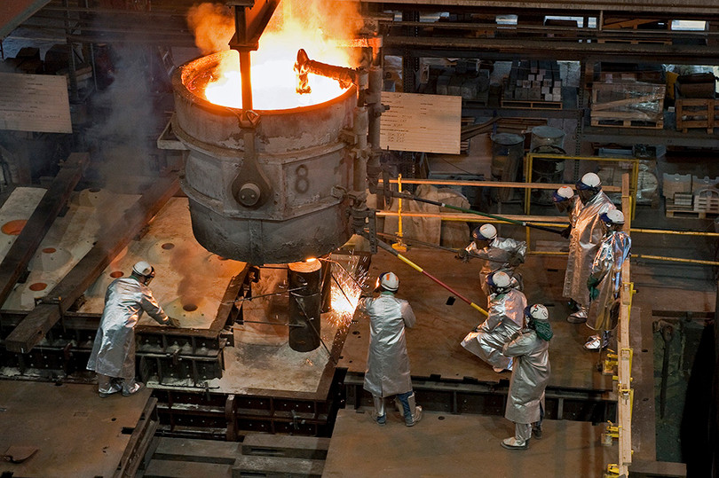 Newport News Shipbuilding vận hành một xưởng đúc thép riêng và tại đây các công nhân đang đúc những chiếc ống luồn mỏ neo cho tàu USS John F. Kennedy.
