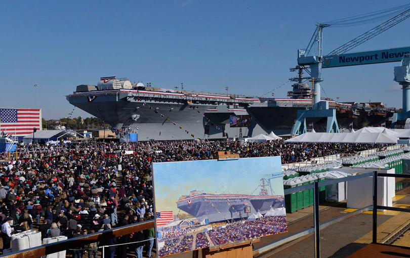 Bức ảnh chụp từ trên cao cho thấy toàn cảnh con tàu USS Gerald R. Ford trong quá trình hoàn thiện. Tàu đã nằm tại ụ khô Dry Dock 12 trong xấp xỉ 7 năm và sau 25 năm phục vụ, tàu sẽ được đưa trở lại ụ khô này.