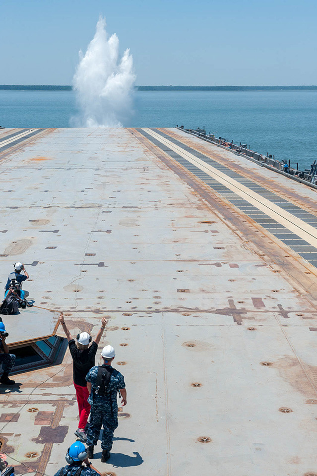 Một thành phần không thể thiếu trên boong tàu sân bay chính là hệ thống phóng máy bay (catapult). Trong hình là hoạt động thử nghiệm hệ thống phóng máy bay điện từ mới của Hải quân Mỹ. Trên boong tàu USS Gerald R. Ford, họ đã phóng thử một chiếc xe trượt có trọng lượng tương đương máy bay chiến đấu xuống sông James.