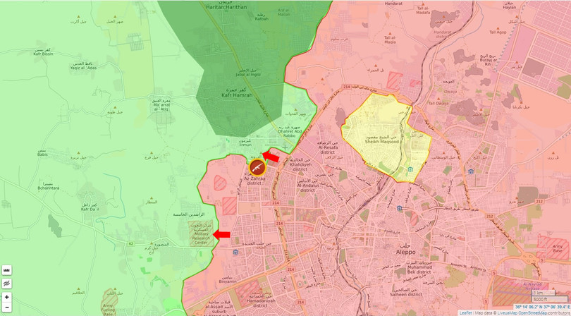 Quân đội Syria tấn công ác liệt vào các khu dân cư quận Mansourah, Rashideen 5, Trung tâm Nghiên cứu khoa học quân sự Aleppo và khu dân cư gần quận Jam'iyat al-Zahraa. South Front dẫn nguồn tin quân sự tại thành phố Aleppo cho biết, giao chiến đang diễn ra dữ dội trong khu vực cao điểm Shouihneh.