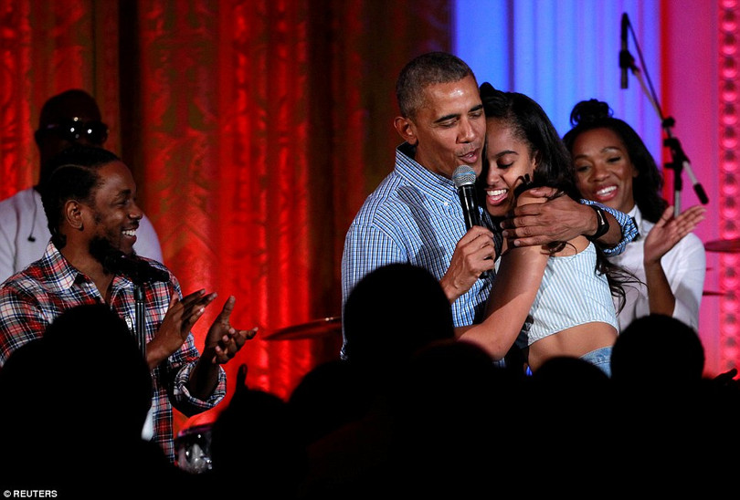 Đáp lại tình cảm của cha mình, Malia đã bước lên sân khấu và vòng tay ôm chầm lấy ông