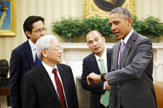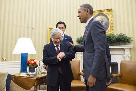 Tổng thống Obama và Tổng Bí thư Nguyễn Phú Trọng cùng nhìn đồng hồ sau cuộc hội đàm kéo dài hơn dự kiến hàng chục phút