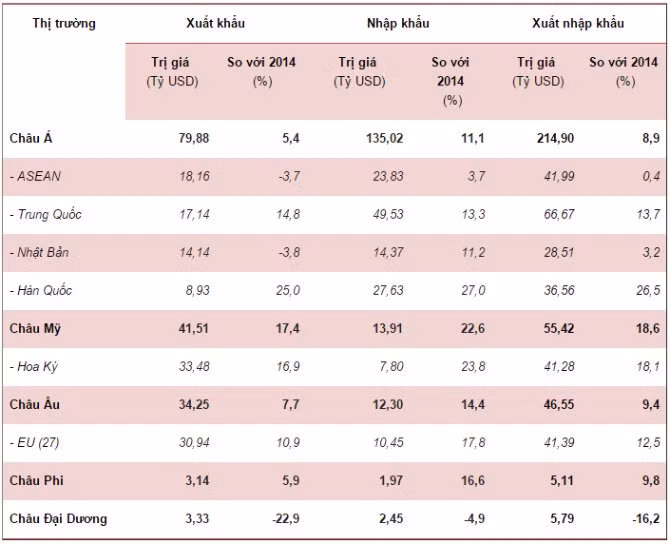 Xuất khẩu hàng hóa sang thị trường Trung Quốc và Hàn Quốc lần lượt là 16,6 tỷ, tăng 11,2% và 8,93 tỷ, tăng 25,03% so với năm 2014. Bên cạnh đó xuất khẩu sang Nhật Bản giảm 3,8%, tương đương giảm 556 triệu USD so với năm 2014.