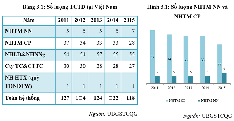 Báo cáo Tổng quan thị trường tài chính 2015 vừa được Ủy ban Giám sát Tài chính Quốc gia công bố cho thấy, đến cuối năm 2015, hệ thống các tổ chức tín dụng Việt Nam đang có tổng cộng 118 tổ chức tín dụng thành viên, chia làm 4 nhóm: Ngân hàng thương mại Nhà nước, Ngân hàng Thương mại cổ phần, Ngân hàng liên doanh và Ngân hàng nước ngoài; Công ty tài chính; Ngân hàng hợp tác xã (quỹ tín dụng nhân dân).