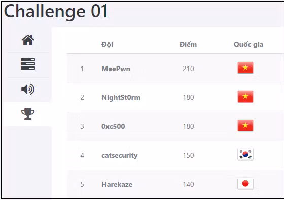 Sau 8 giờ tranh tài sôi nổi (từ 9h tới 17h ngày 25/2/2017) cuộc thi an ninh mạng WhiteHat Challenge 01 đã tìm ra người chiến thắng. Ngôi vị quán quân của cuộc thi đã thuộc về MeePwn, đội thi của nước chủ nhà Việt Nam. Đây cũng là đội ghi được điểm số đầu tiên và dẫn đầu trong phần lớn thời gian diễn ra cuộc thi WhiteHat Challenge 01. Mặc dù có những thời điểm đội chơi Harekaze (Nhật Bản) và NightSt0rm (Việt Nam) vươn lên dẫn đầu bảng xếp hạng, nhưng cuối cùng MeePwn vẫn xuất sắc giành ngôi vị cao nhất của cuộc thi WhiteHat Challenge 01. Xếp thứ 2 và thứ 3 lần lượt là các đội chơi NightSt0rm và Oxc500.