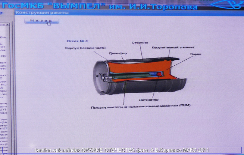 Tên lửa trang bị bộ phận kích nổ laser. Thiết bị phát xung laser sẽ chiếu xạ mục tiêu và xác định thời điểm nổ theo thời gian thu tín hiệu phản xạ (trên khoảng cách tối ưu đến mục tiêu). Thông số của bộ phận kích nổ đầu đạn phù hợp với kích thước của mục tiêu cần tấn công. Ngoài ra còn có thiết bị gây nổ do tiếp xúc trong trường hợp tấn công trực tiếp hoặc phóng vào mục tiêu mặt đất, mặt nước trong chế độ bắn ứng dụng hoặc tự hủy.