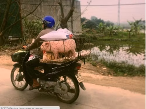 Ảnh người dân chở lợn được diễn viên Thomas Mann thích thú chia sẻ trên trang cá nhân
