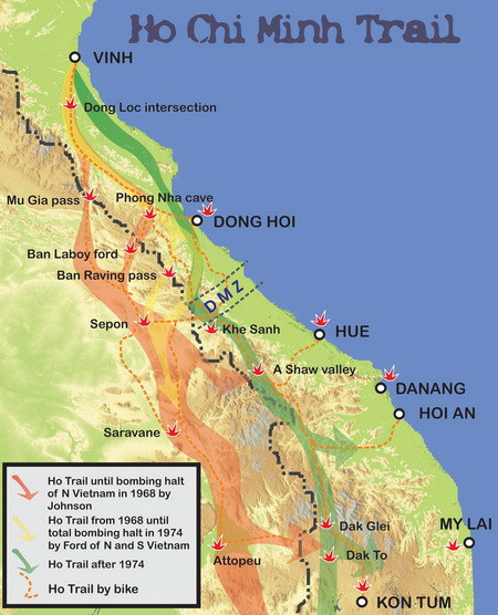 Các tuyến đường bộ mang tên Hồ Chí Minh, mở rộng và kéo dài đến hàng trăm dặm, xuyên qua rừng Trường Sơn, tiến sâu vào các khu rừng bạt ngàn của các nước láng giềng Lào và Campuchia. Ở một số vùng, các tuyến đường mòn đã được xây dựng trở thành những con đường mà các xe vận tải của Liên Xô và Trung Quốc có thể cơ động được dưới những tán lá rừng.