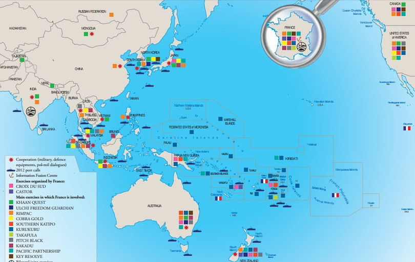 Để đảm bảo cho an ninh kinh tế và lợi ích quốc gia. Trên Thái Bình Dường Pháp đã thiết lập các cuộc đối thoại cấp cao và xây dựng quan hệ đối tác chiến lược với Nhật Bản (1995, đến cấp bộ trưởng vào năm 2012), Trung Quốc (1997), Ấn Độ (1998), Indonesia (2011), Úc (2012), Singapore (2012) và Việt Nam (2013). Pháp đã thiết lập một mối quan hệ chiến lược quốc phòng chặt chẽ với Malaysia.