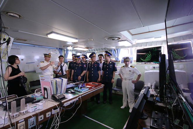 Sau lễ đón, đại diện tàu Yashima đã mời cảnh sát biển Việt Nam lên tham quan tàu, giới thiệu các tính năng, thiết bị...
