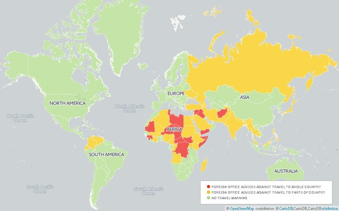 Theo cảnh báo trên trang web của Bộ Ngoại giao Anh, du khách không nên đến tham quan các vùng sau ở thời điểm này: Afghanistan, Burundi, cộng hòa Trung Phi, Chad, Congo, Guinea, Iraq, Libya, Mauritania, Niger, Palestinian territories, Sierra Leone, Somalia, Somaliland, Nam Sudan, Syria, Tunisia, Yemen.