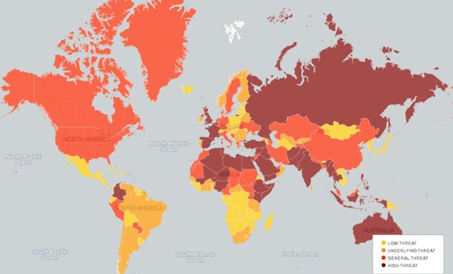 Tấm bản đồ này chỉ rất rõ cho du khách về các vùng có khả năng khủng bố cao và nên suy nghĩ kỹ khi ghé thăm: Libya, Pakistan, Somalia, Nga, Ai Cập, Tunisia, Myanmar, Kenya, Philippines, Colombia, Thổ Nhĩ Kỳ, Thái Lan, Australia, Bỉ, Iraq, Saudi Arabia, Yemen, Syria, Lebanon, Israel, Afghanistan.