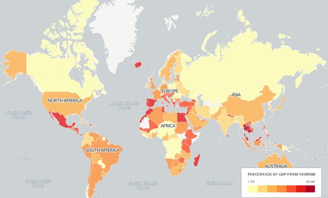 Bản đồ này chỉ ra các quốc gia trên thế giới là điểm nóng du lịch, và tại những nước tô màu đỏ là nơi mà phần lớn thu nhập của người dân dựa trên du lịch.
