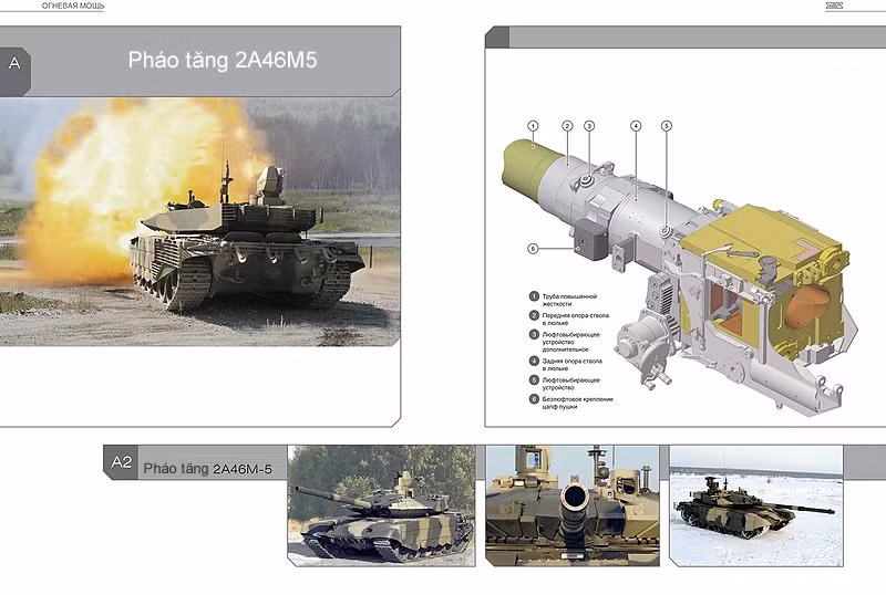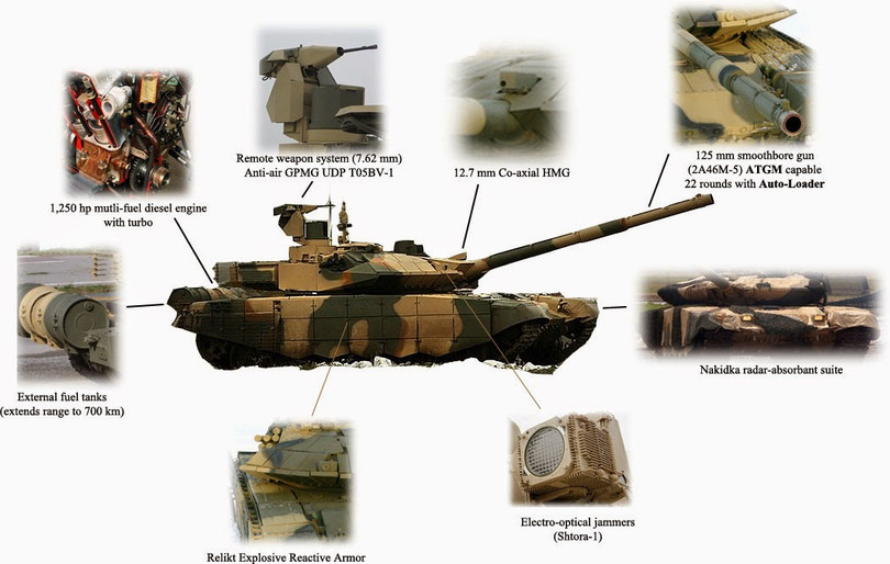 Pháo tăng: 2A46M-5-125 mm trơn, có thể sử dụng đạn xuyên giáp dưới cỡ, xuyên giáp hiệu ứng nổ lõm, đạn nổ phá mảnh, tên lửa có điều khiển bắn qua nòng pháo.