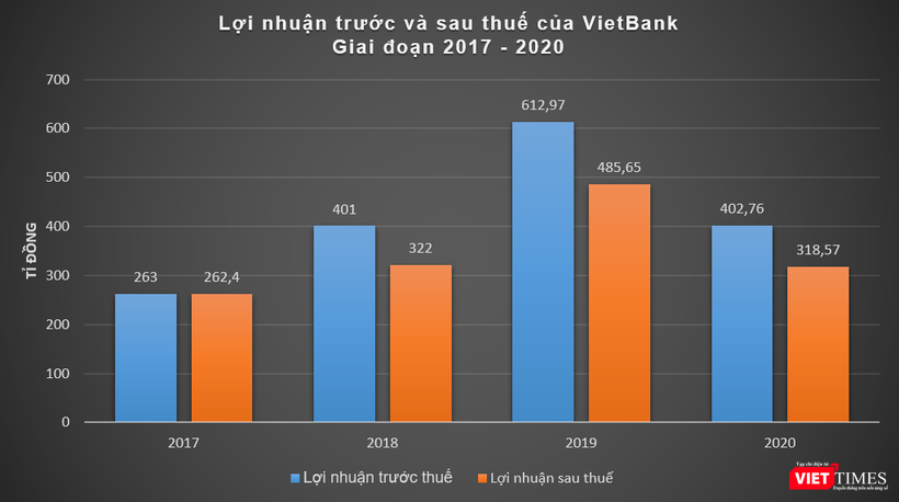 Năm 2020, lợi nhuận trước và sau thuế của VietBank cùng giảm hơn 30% so với năm 2019, lần lượt đạt 402,76 tỉ đồng và 318,5 tỉ đồng.
