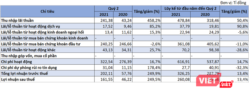 Kết Quý 2/2021, hầu hết các hoạt động kinh doanh của VietBank đều lãi lớn. Cụ thể, thu nhập lãi thuần đạt 241,3 tỉ đồng, tăng 5,5 lần (tăng 458%) so với cùng kỳ năm ngoái; lãi thuần từ hoạt động dịch vụ đạt 17,5 tỉ đồng, tăng 85,2%; lãi thuần từ hoạt động kinh doanh ngoại hối đạt 13,4 tỉ đồng, tăng 15,3%; lãi từ hoạt động khác là 43,1 tỉ đồng, tăng 25,7%.