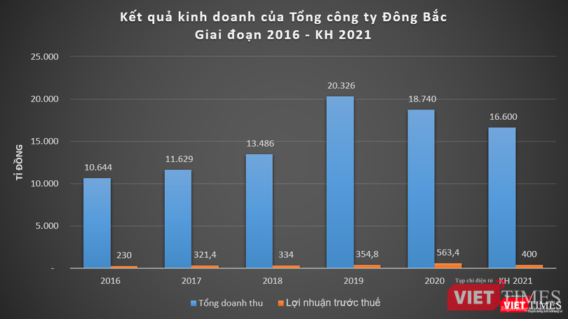 Năm 2021, Tổng công ty Đông Bắc đặt kế hoạch tổng doanh thu 16.600 tỉ đồng, giảm 11,4% so với năm ngoái. Lợi nhuận trước và sau thuế lần lượt ở mức 400 tỉ đồng và 320 tỉ đồng, giảm lần lượt 29% và 28% so với mức thực hiện năm 2020./.