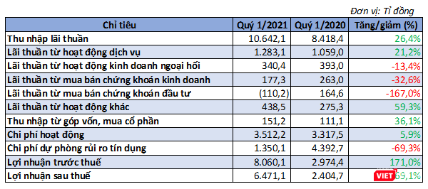 Cụ thể, thu nhập lãi thuần trong 3 tháng đầu năm 2021 của VietinBank đạt 10.642 tỉ đồng, tăng 26,4% so với cùng kỳ năm ngoái. Lãi thuần từ hoạt động dịch vụ đạt 1.283,1 tỉ đồng, tăng 21,2% so với Quý 1/2020.